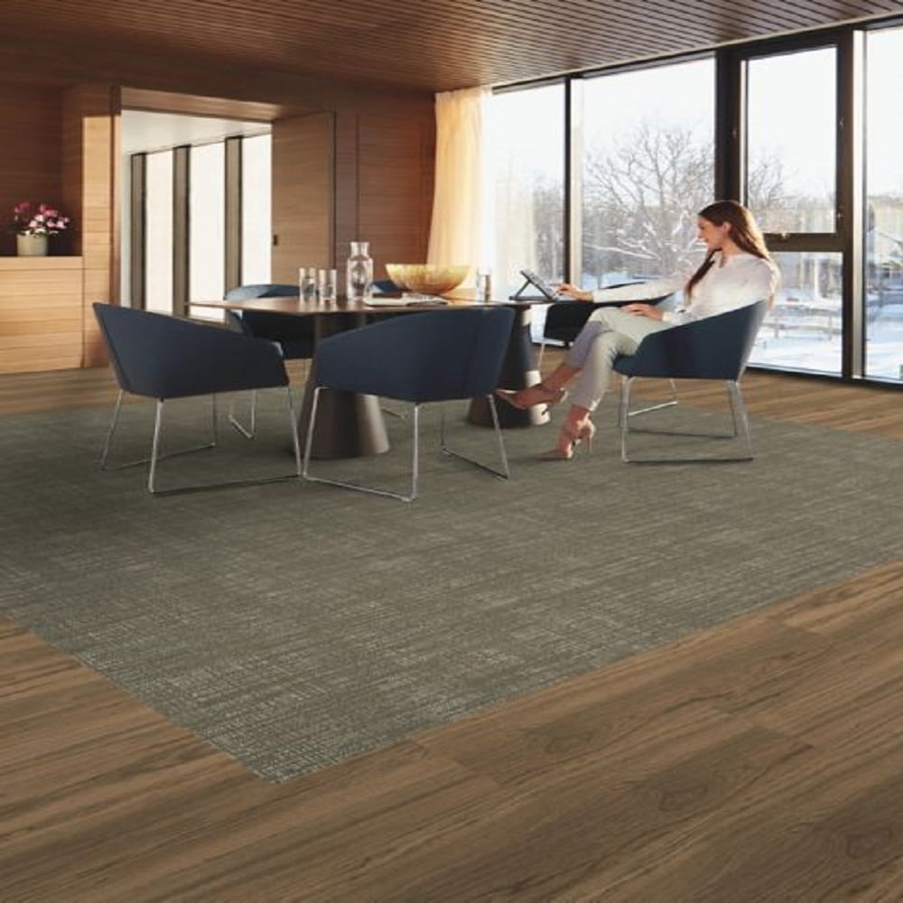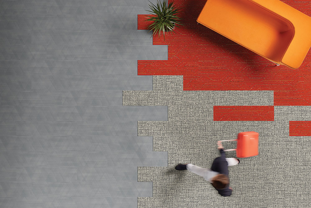A mescla de LVTs (Luxury Vinyl Tiles) em réguas ou placas com carpetes modulares responde diretamente às novas demandas dos ambientes corporativos: