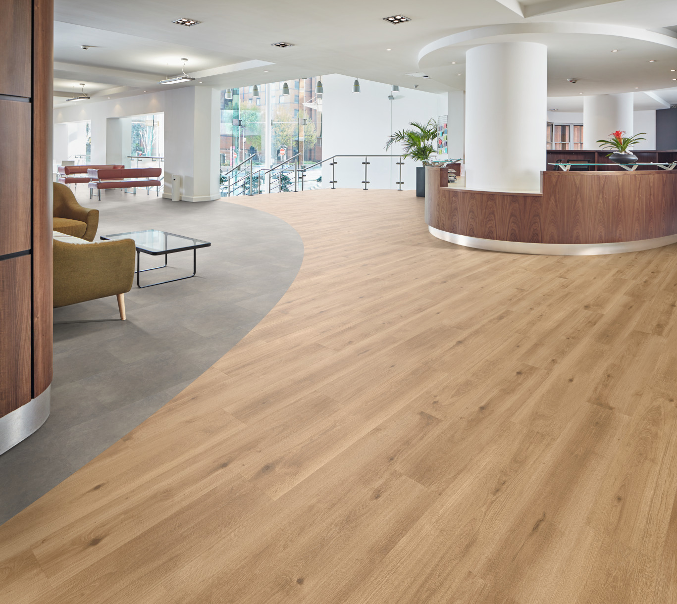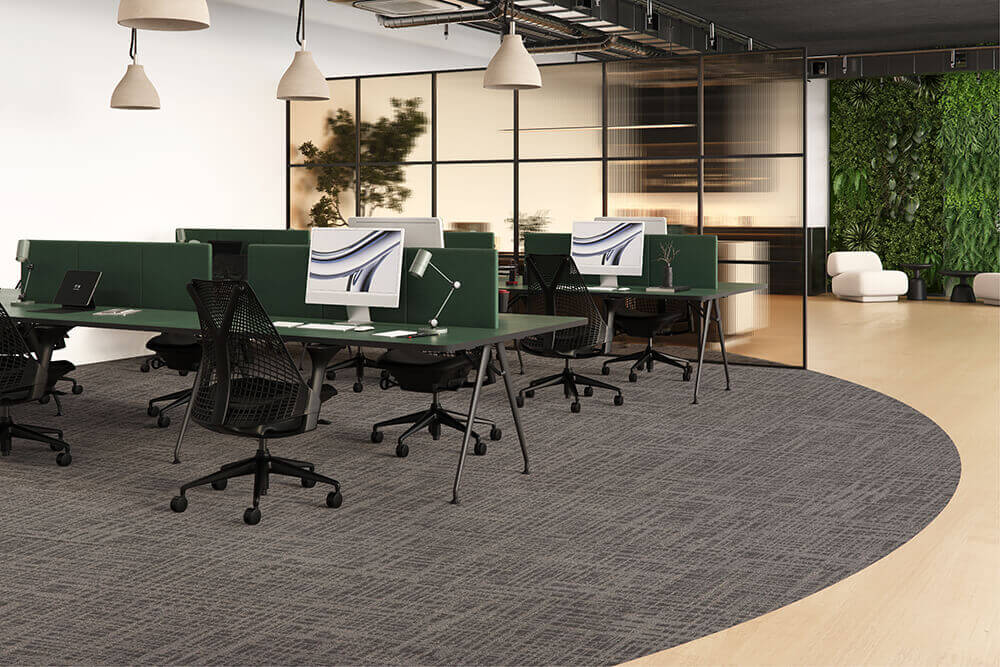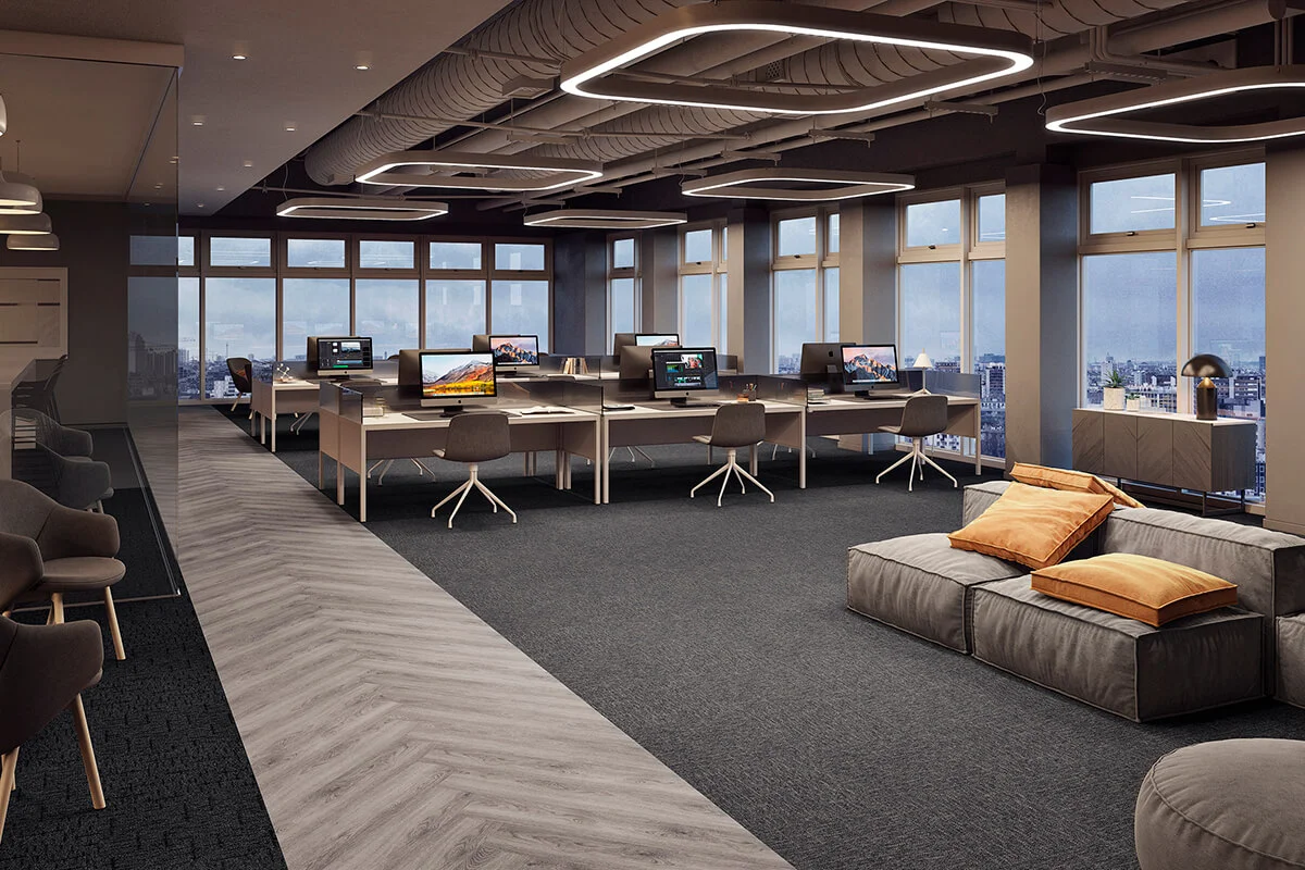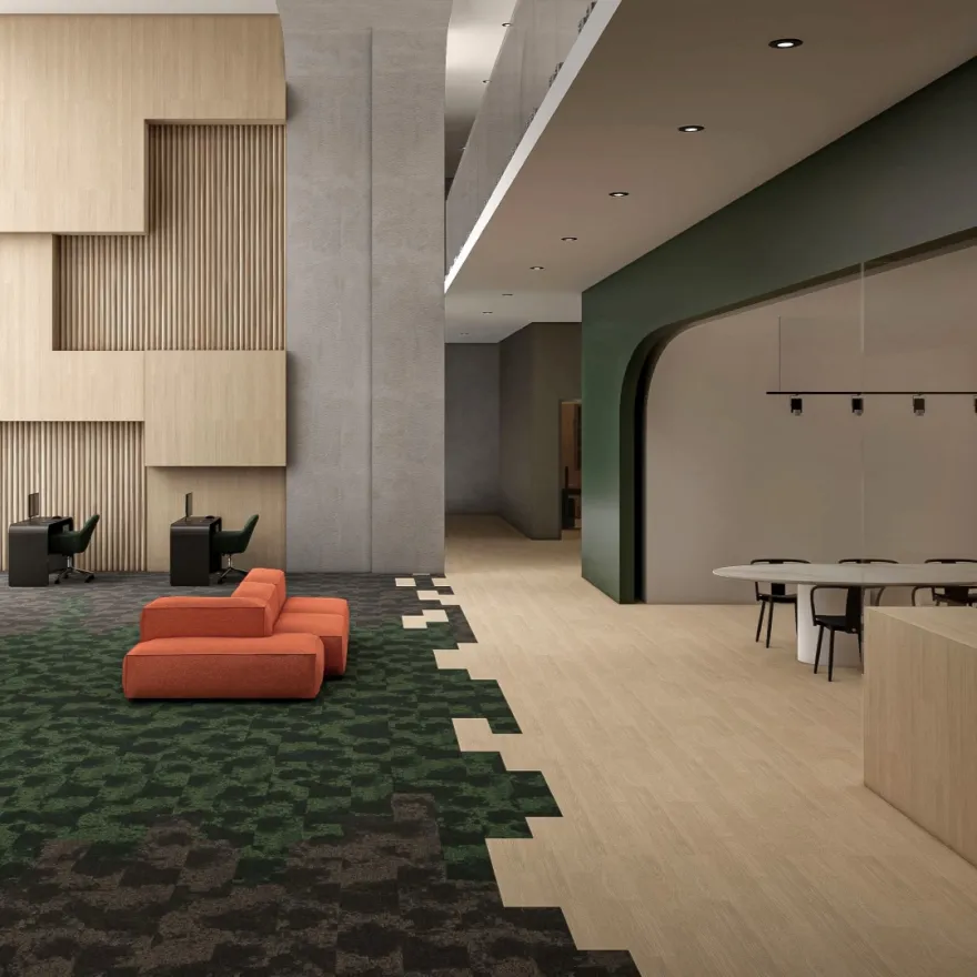 Tendências de pisos corporativos para 2026: a força da combinação entre LVT e carpetes em placa