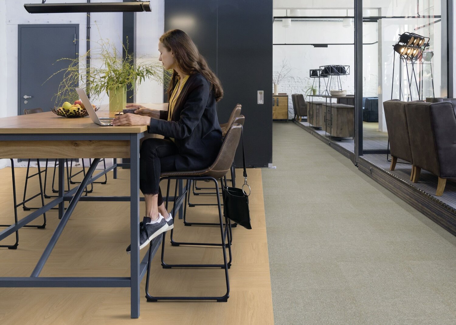 Já a Gerflor aposta na combinação entre os LVTs Saga Creation™ (Loose Lay) e os carpetes Armonia™. Os desenhos, cores e espessuras foram pensados para garantir transições suaves, instalação rápida e excelente desempenho acústico — uma solução eficiente para escritórios modernos e pavimentos elevados.