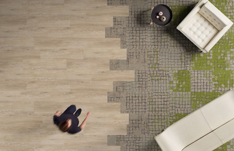 Dois projetos corporativos recentes exemplificam com excelência o uso combinado de carpetes e LVT:
